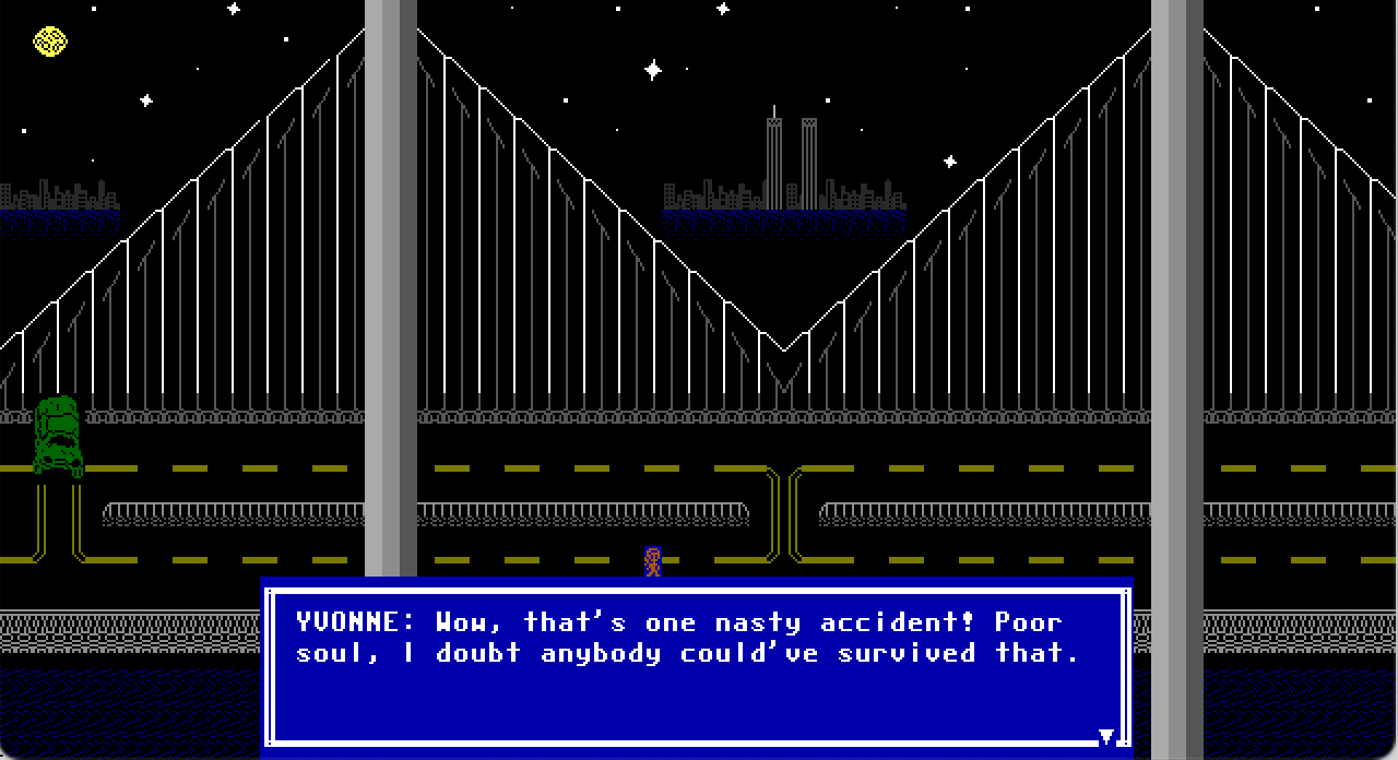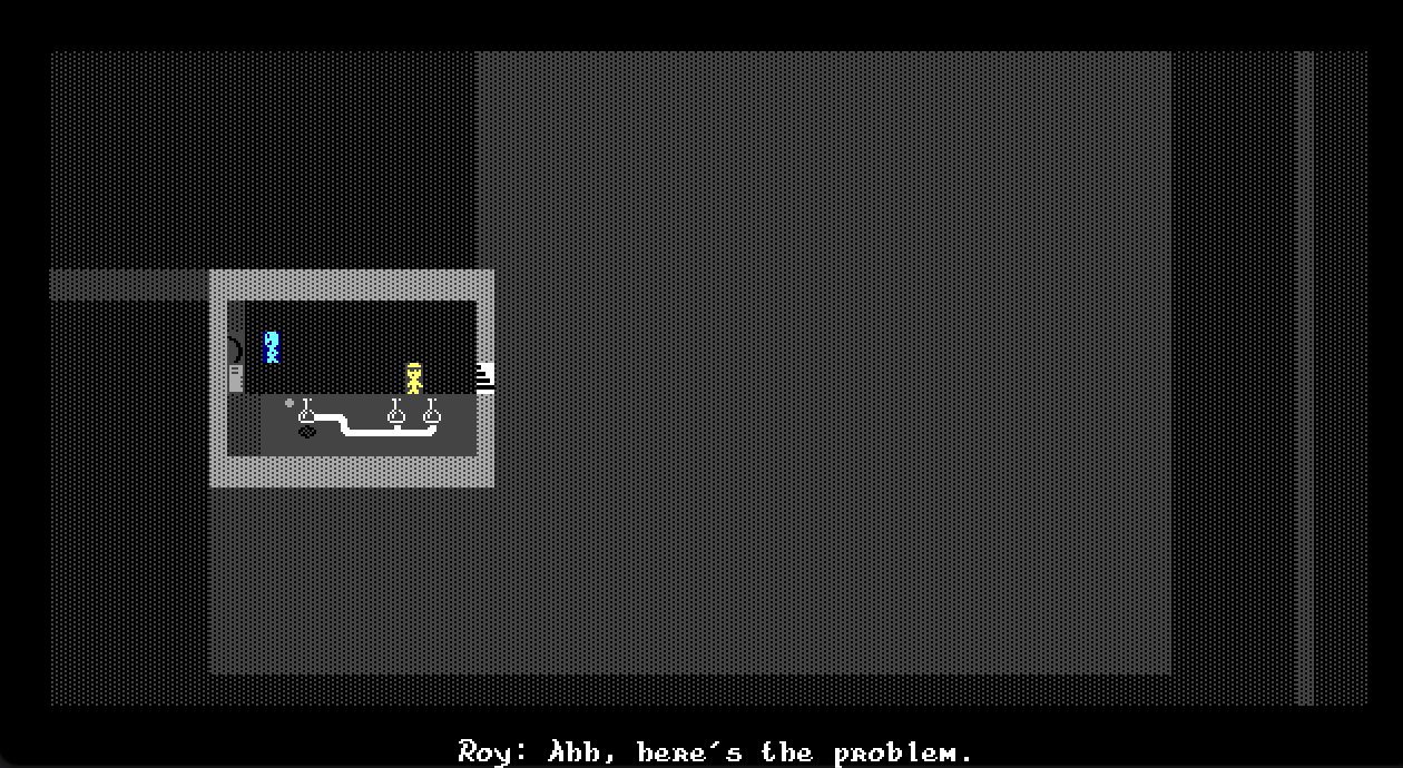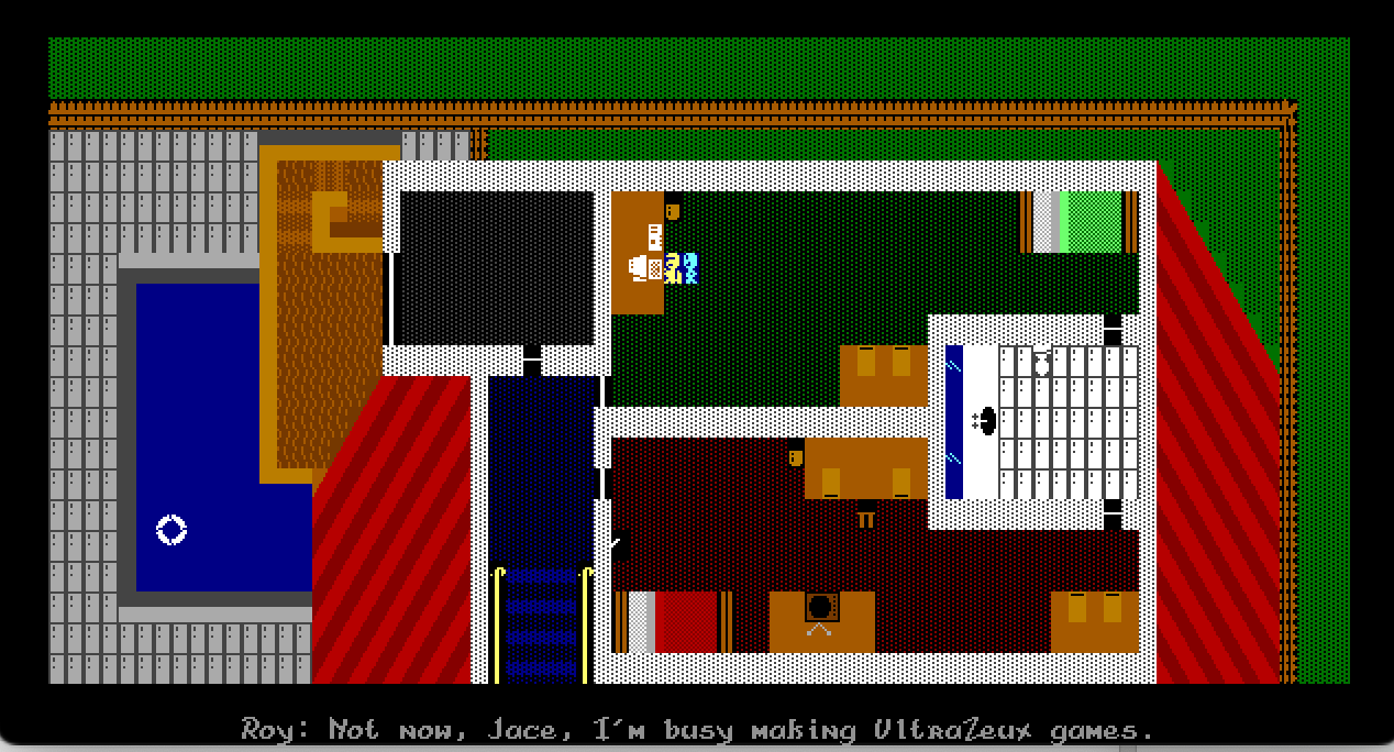 A typical game scripting scenario can be found at the beginning of Weirdness. A character named Roy sits at his computer in his house. If the player touches him, he says “Not now, Jace, I’m busy making UltraZeux games”.